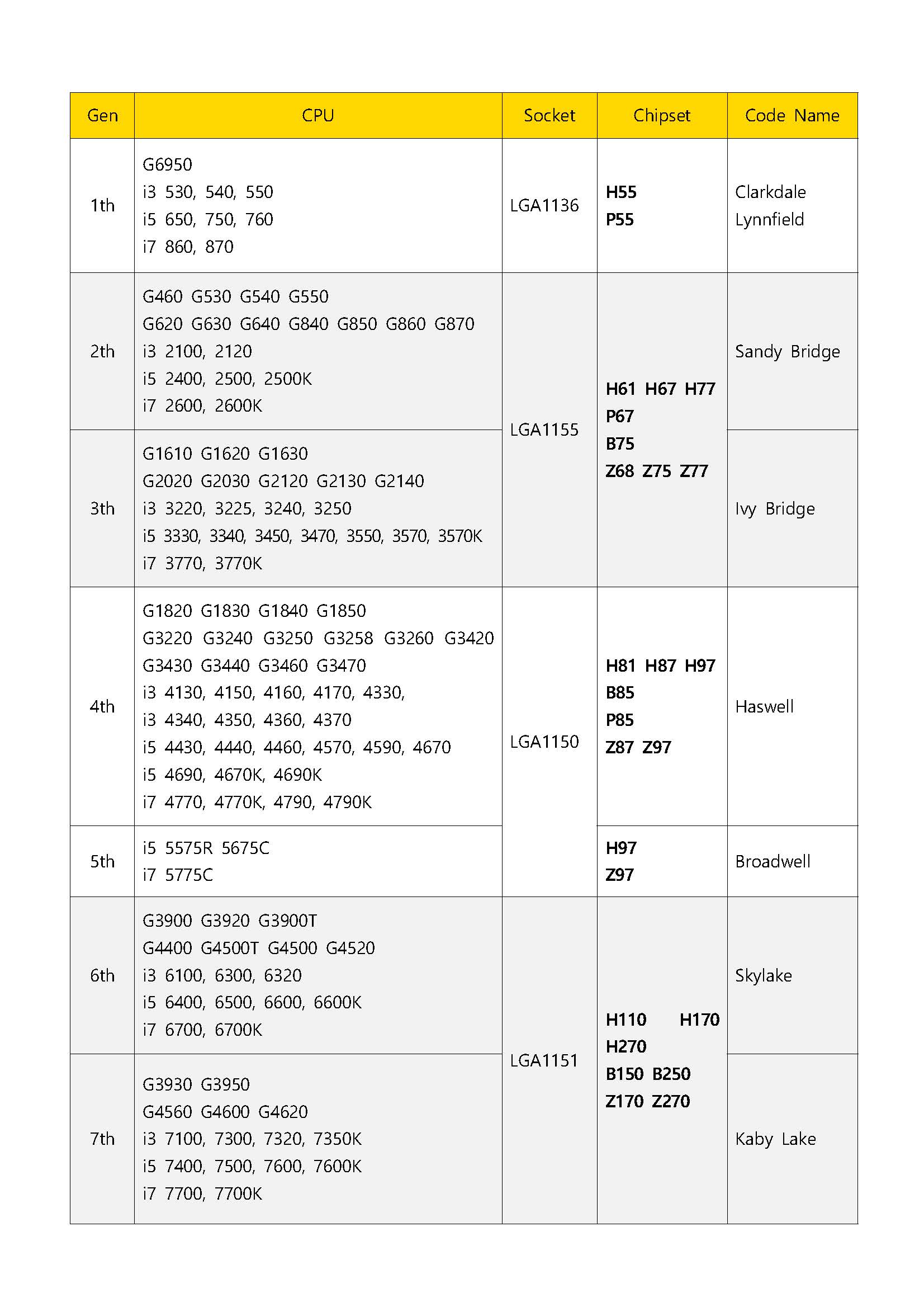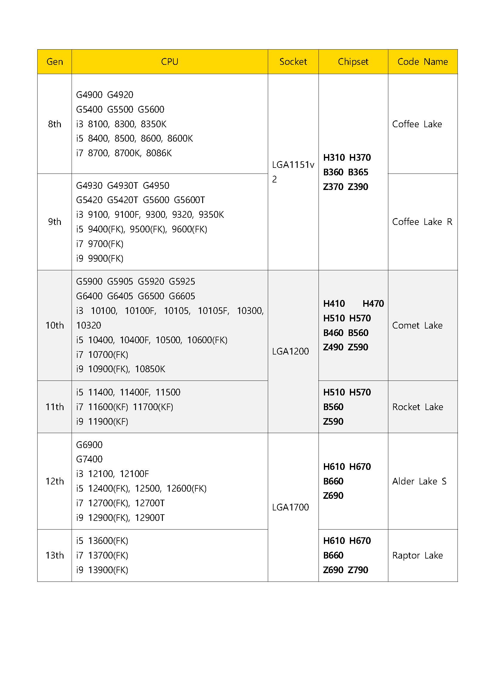 최근 너무 복잡해져서 인텔CPU와 메인보드의 호환성을 정리할 필요를 느껴서 한번 해봄 어차피 나한테 별 필요없는 모바일과 하이엔드 데스크탑CPU는 제외하고 일반 데스크탑CPU만 정리했음 Gen CP