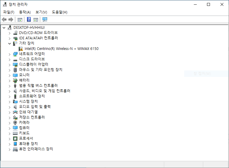 삼성 노트북 : Intel Centrino Wireless-N + WiMAX 6150 드라이버 설치하기 삼성 NT301VA 시리즈 노트북 Windows 10 설치 후 장치관리자에 아래 그림과 같이 경고 표시가 붙은 하드웨어 장치가 있습니다. "기타 장