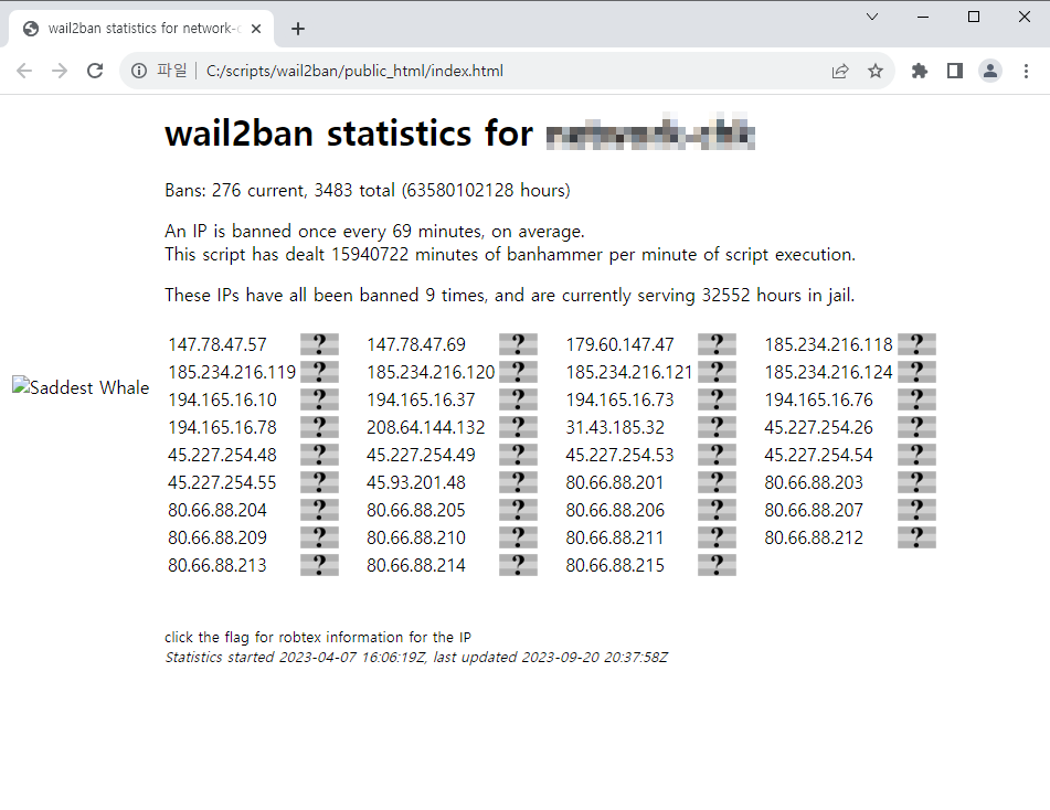 - wail2ban 레포트를 확인할수 있습니다. 원래 IP별 국가조회 기능이 있었지만 서비스해주는 사이트에서 차단한것 같습니다.