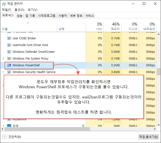 윈도우 재부팅후 작업관리자를 보시면 Windows PowerShell 프로세스가 실행되는것을 볼수 있습니다.