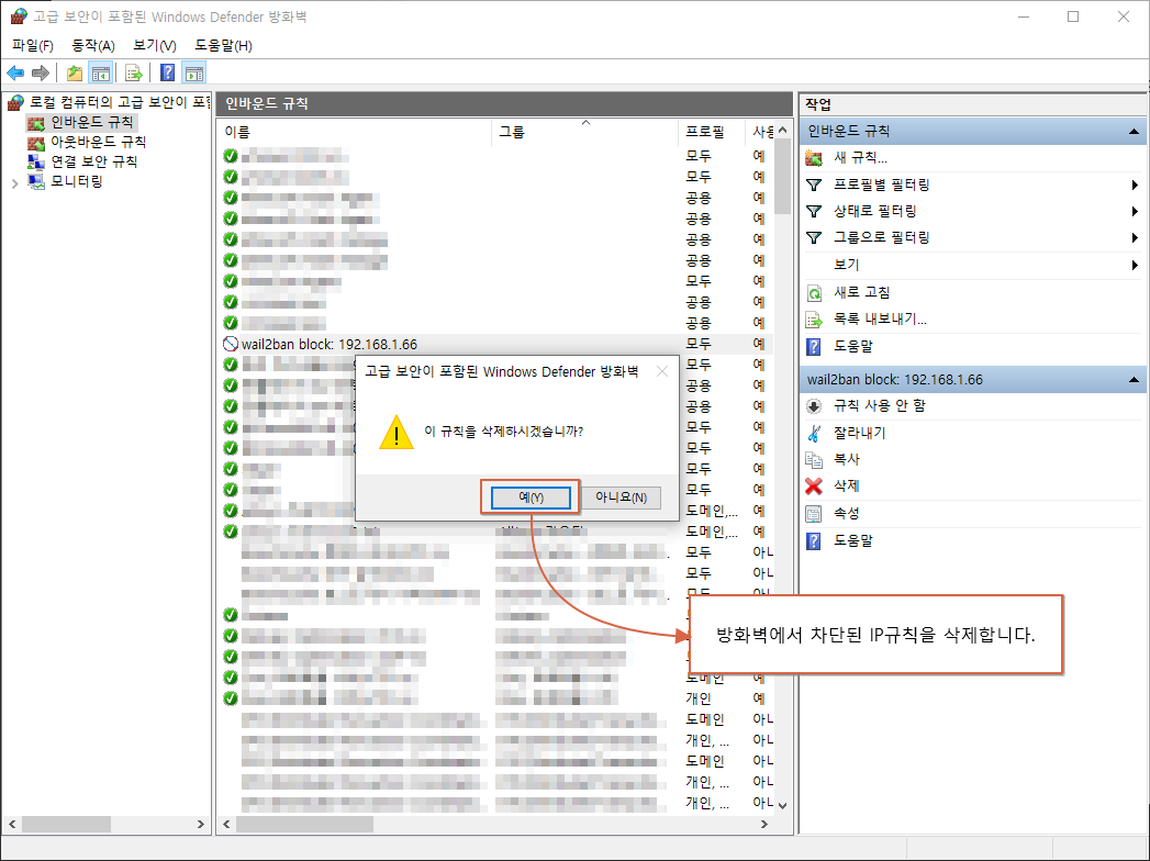 방화벽에서 차단한 IP는 일정시간이 지나면, 다시 허용(방화벽 차단목록 삭제)되도록 구현됩니다.