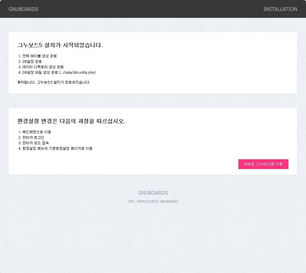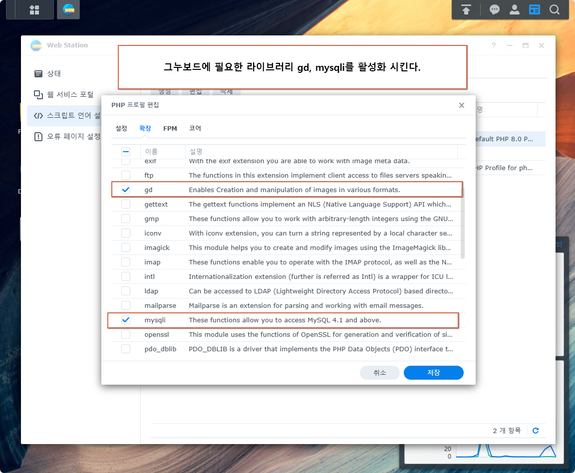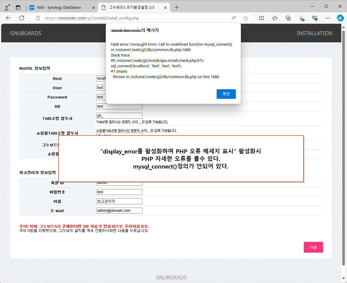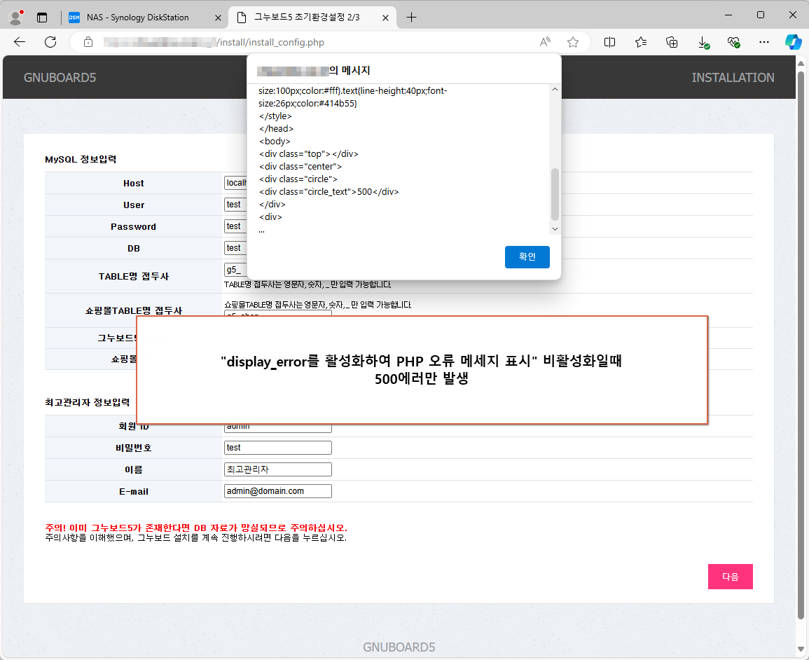 시놀로지에 그누보드5 DB생성과정에 500오류 발생