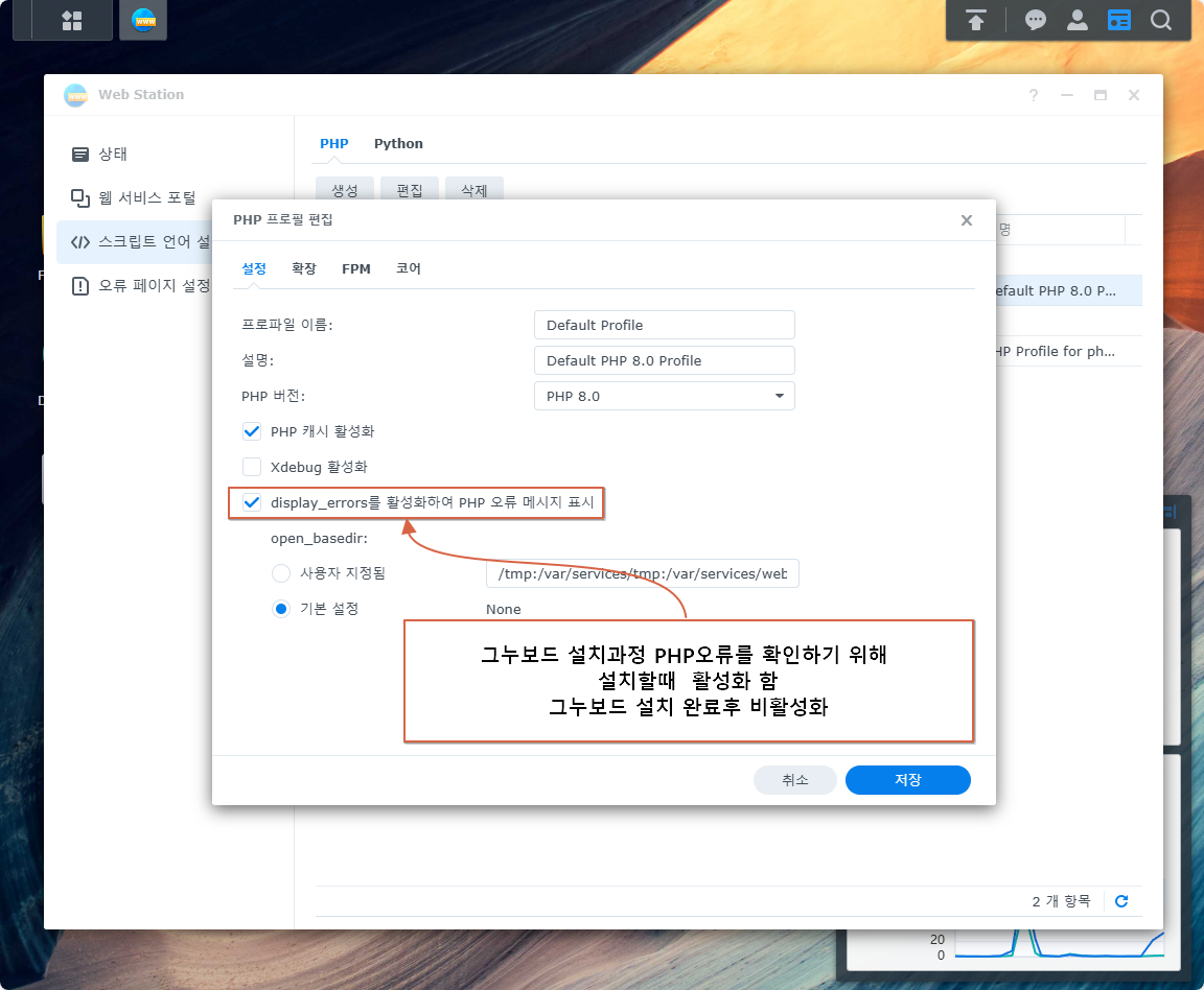 이때 PHP오류메세지를 보이도록 활성화 합니다.
