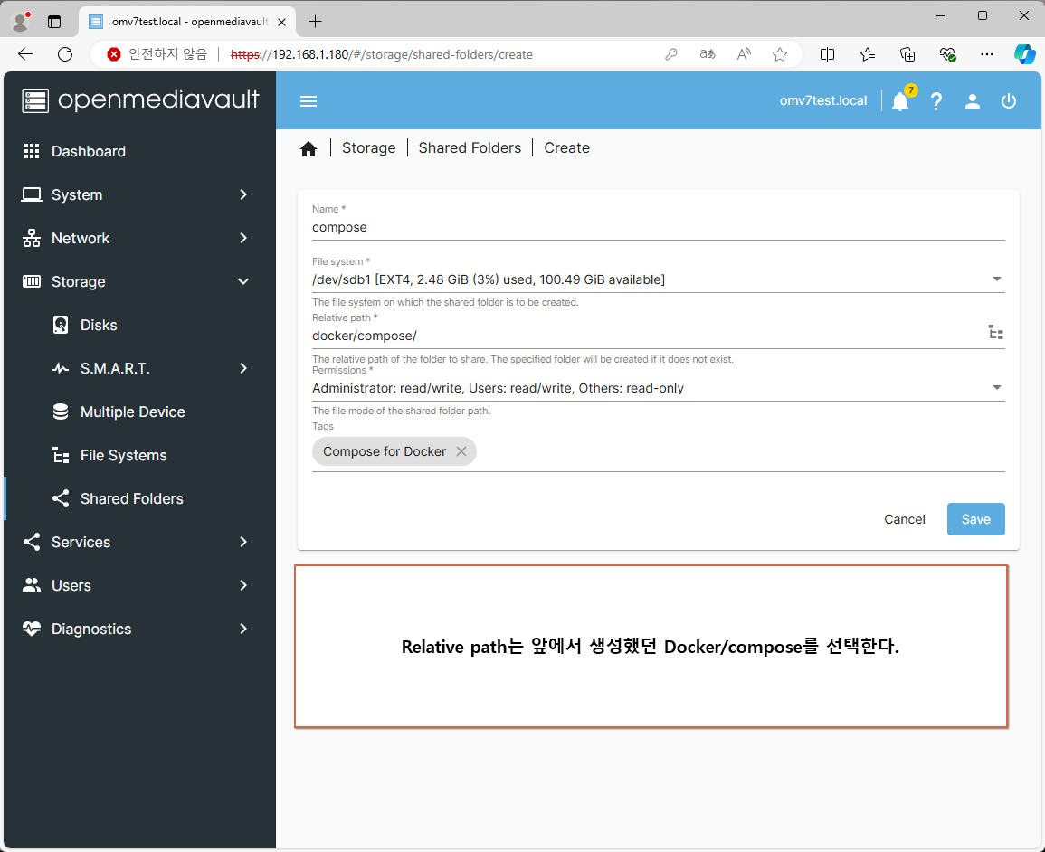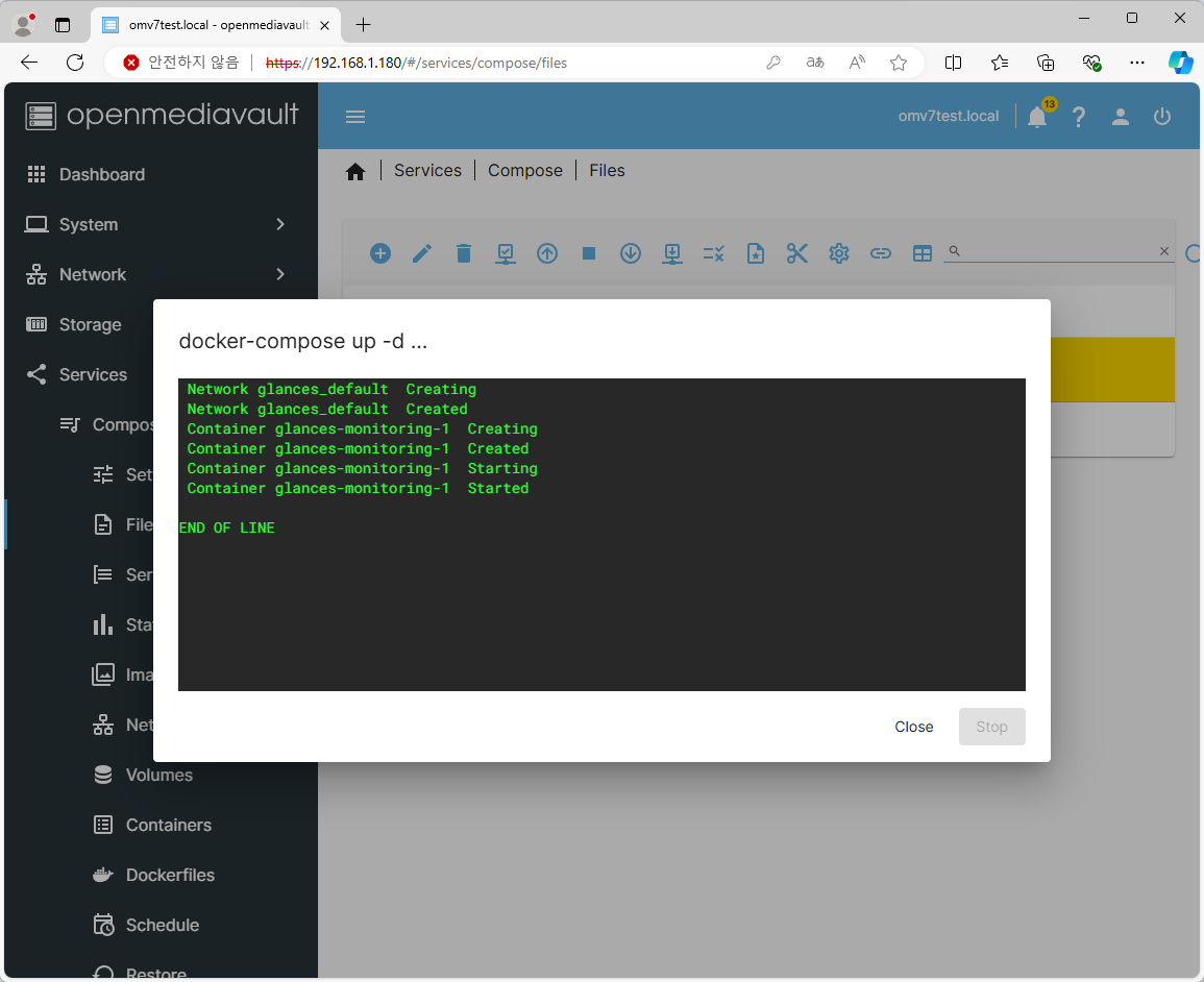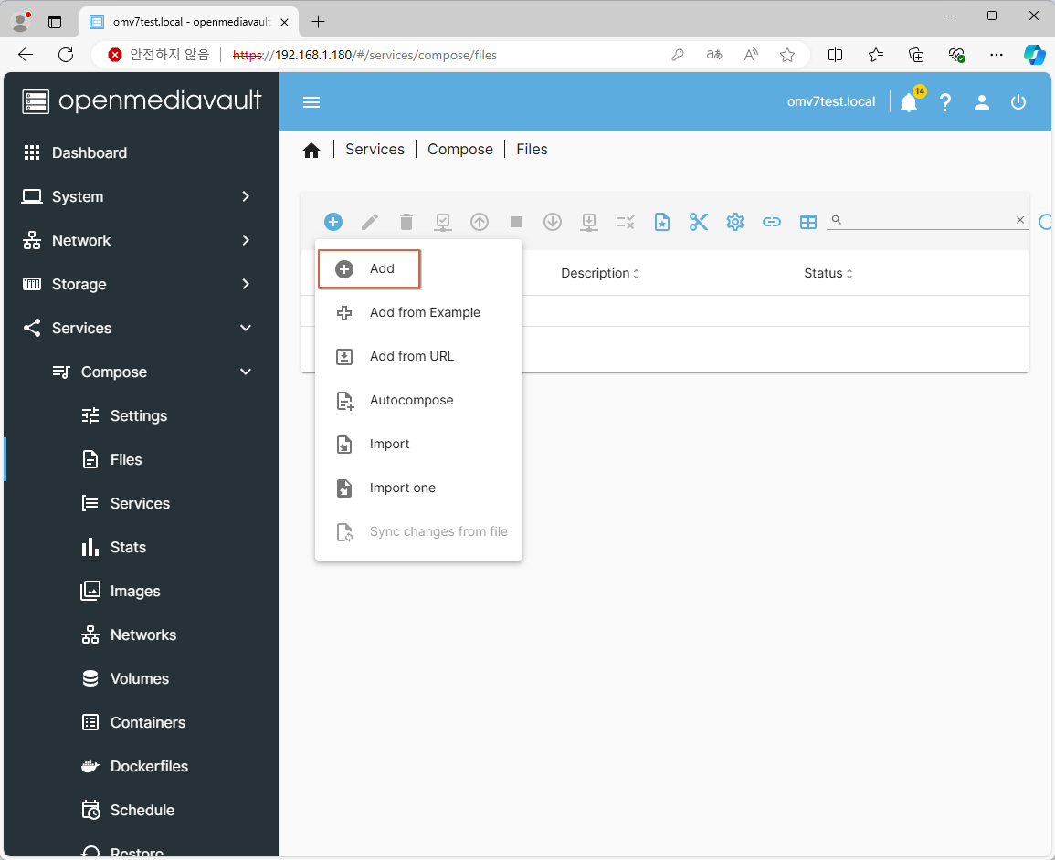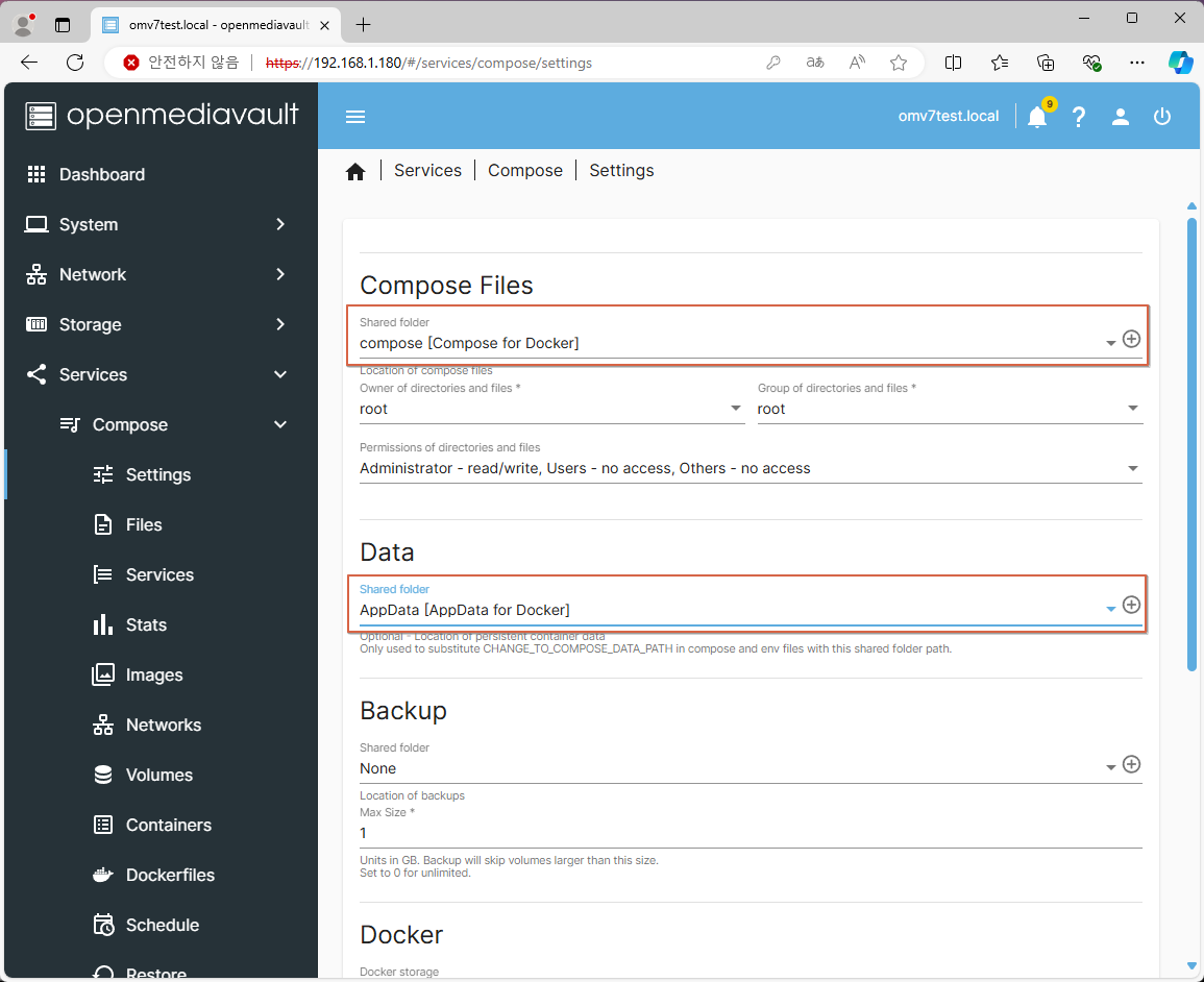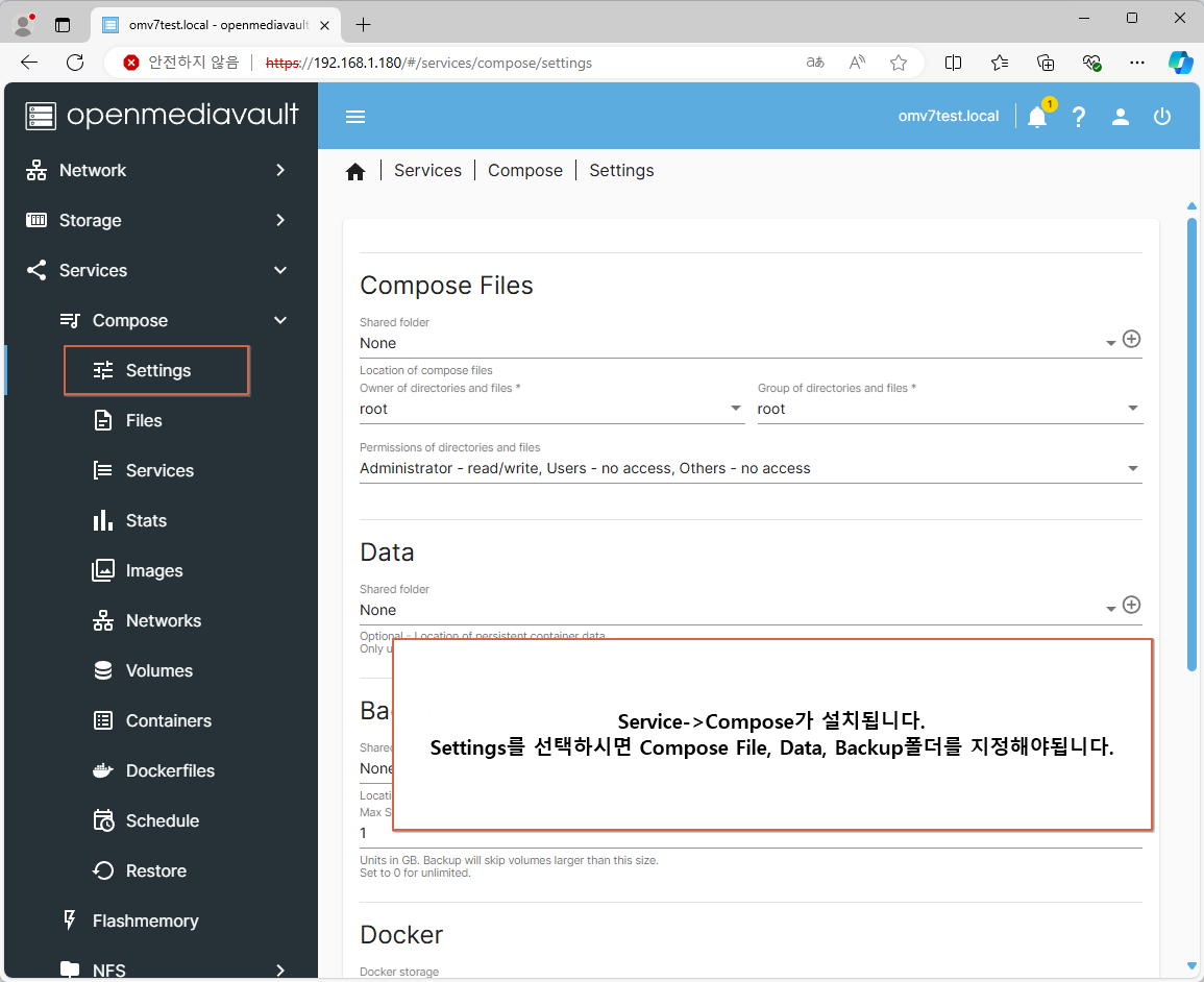 Services -> Compose -> Settings에서 Compose Files, Data 공유폴더를 설정해야 된다.