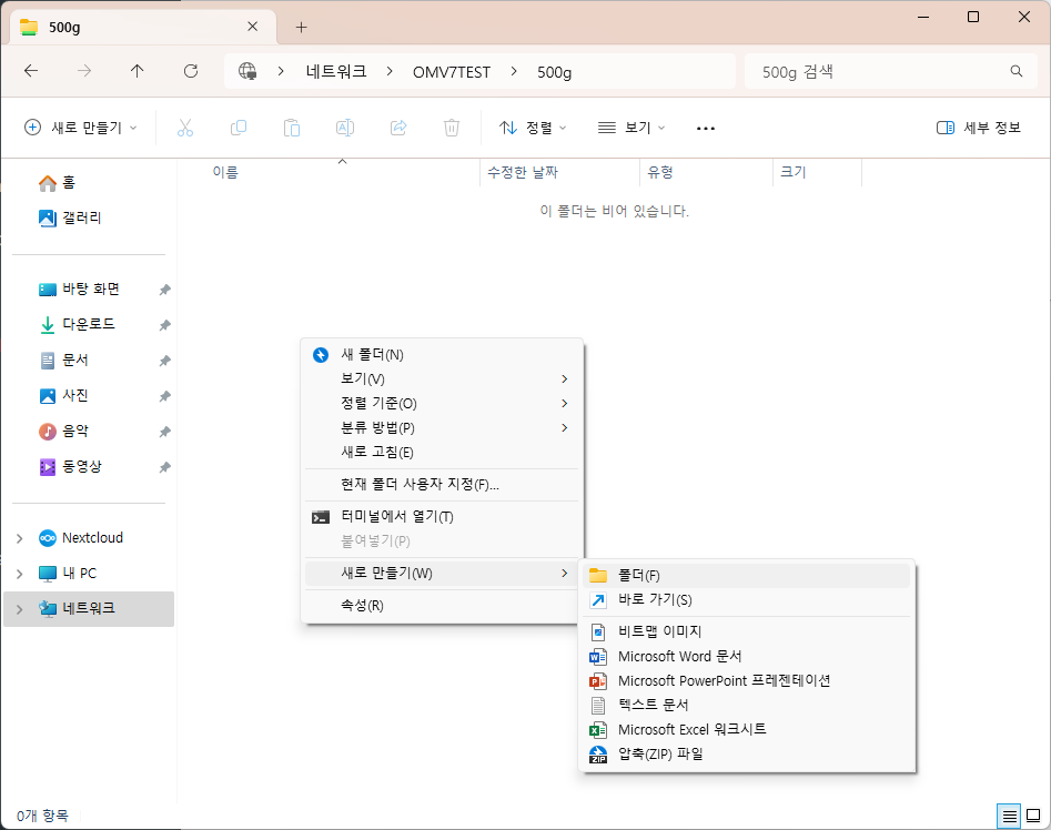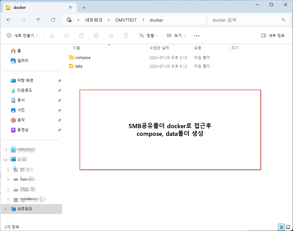 윈도우 탐색기에서 공유된 docker폴더에 compose, data폴더를 생성한다.