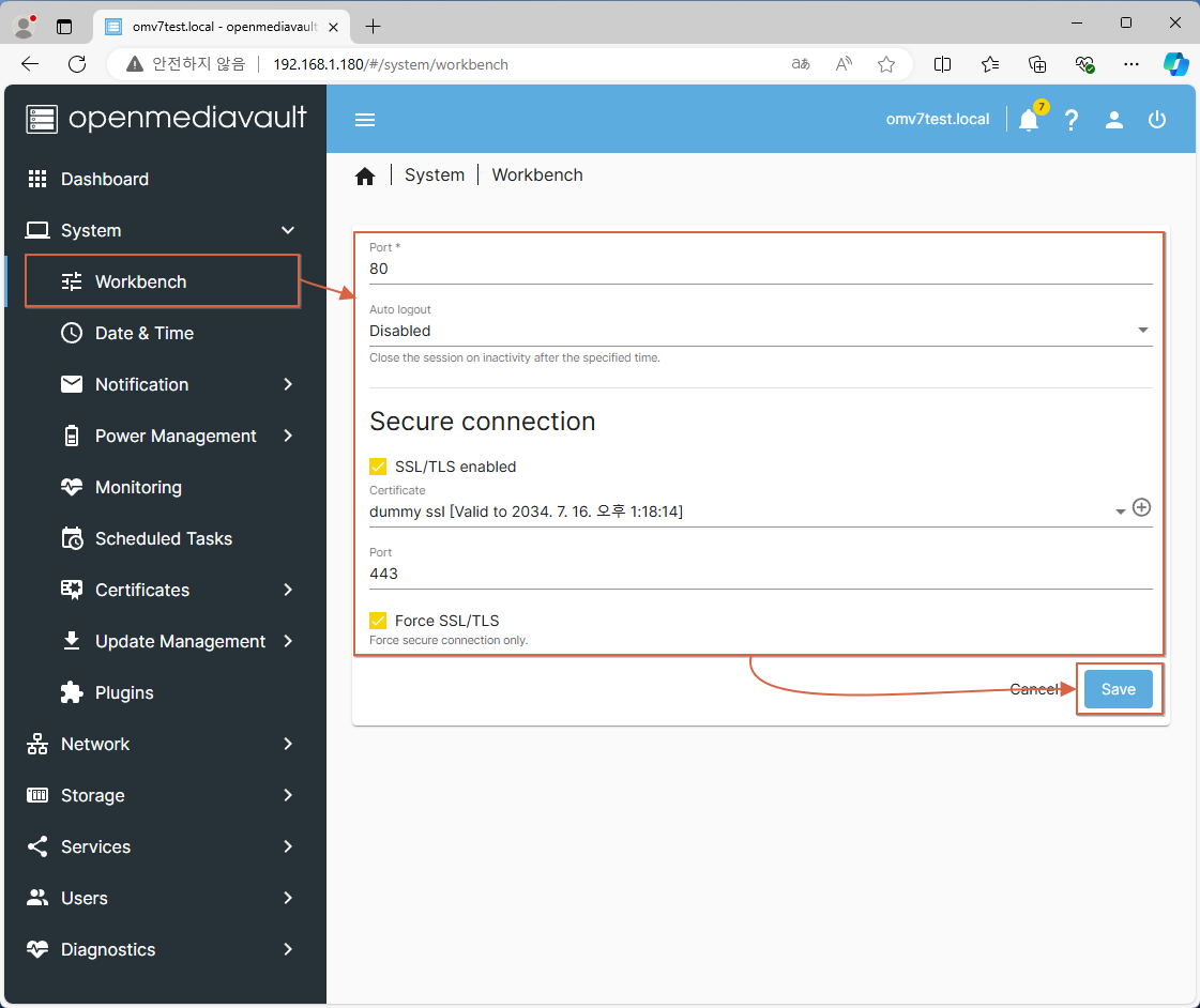(자동로그아웃 해제, SSL인증서 선택, SSL강제접속 활성화)