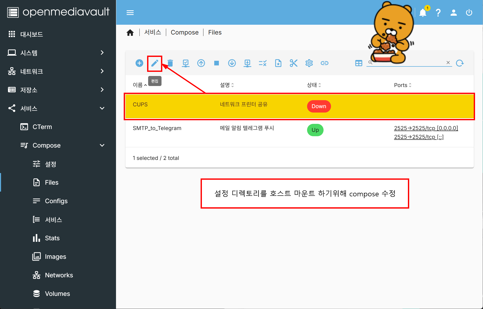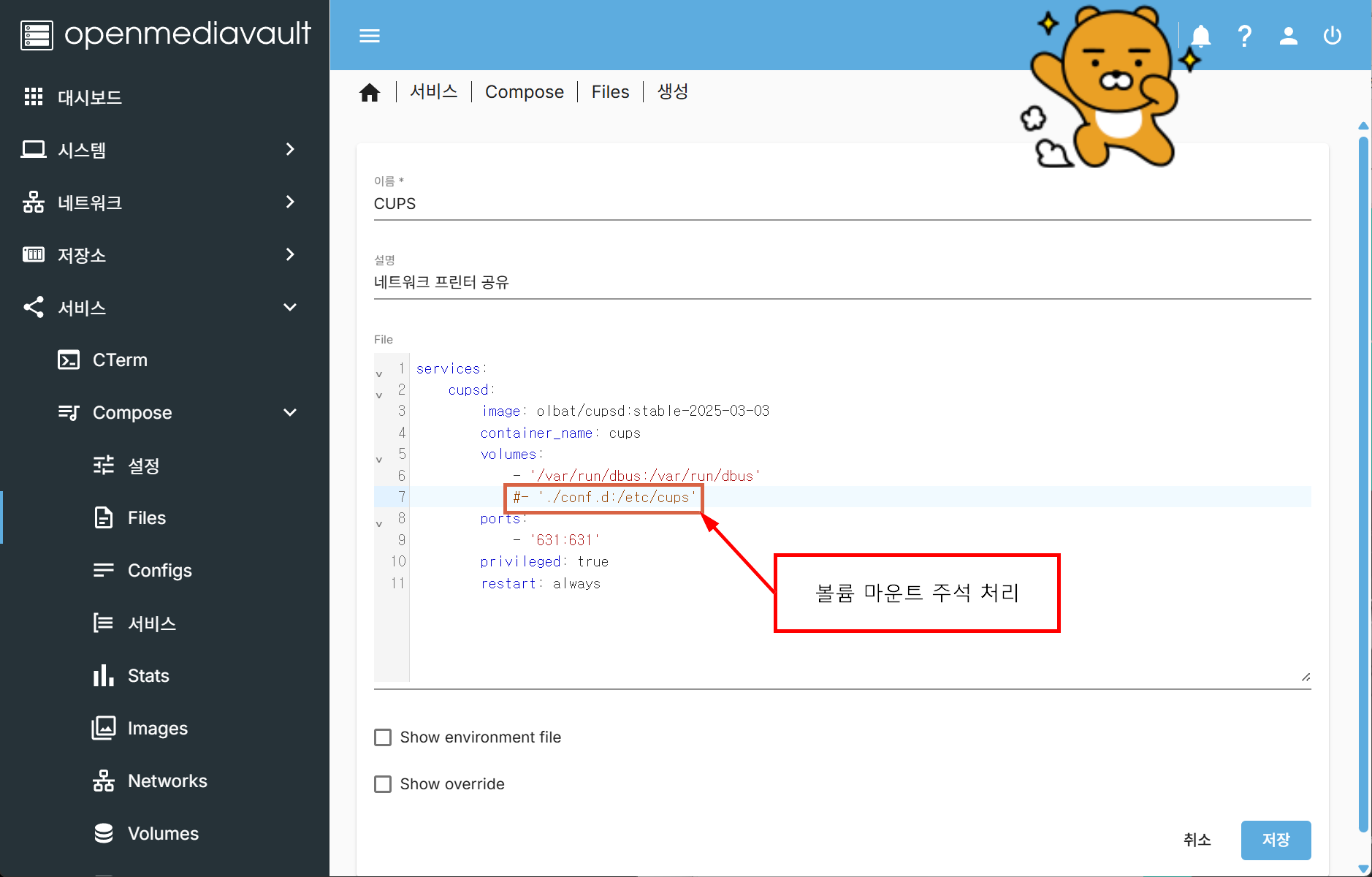 컨테이너에 있는 설정파일을 호스트로 볼륨 마운트를 하는 이유는 CUPS에서 추가한 프린터 정보가 Compose up&down과정에 초기설정으로 돌아가기에 설정값 유지를 위해 볼륨 마운트를 합니다.
