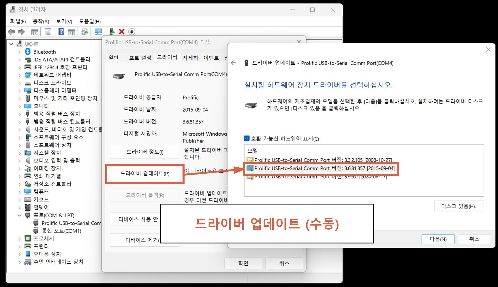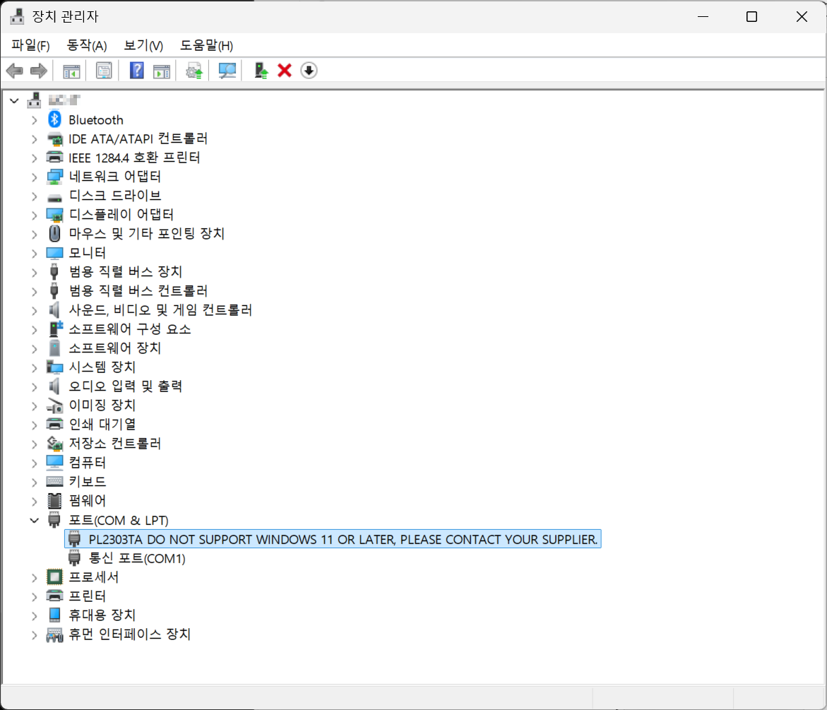 USB to Serail 변환칩 PL2303TA는 윈도우11에서 공식적으로 지원을 안합니다.