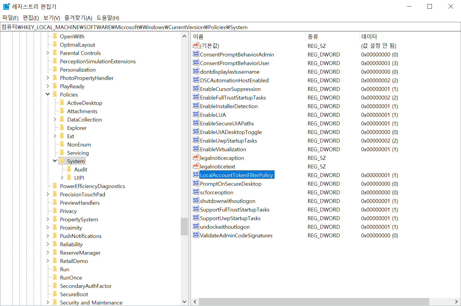 컴퓨터\HKEY_LOCAL_MACHINE\SOFTWARE\Microsoft\Windows\CurrentVersion\Policies\System